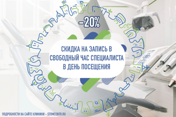![]() Акция «Горящее время» действует при записи к стоматологу в день обращения. Воспользуйтесь специальной формой на нашем сайте или позвоните в ближайший филиал нашей сети стоматологий, и Вам предложат имеющееся свободное время. Скидка 20% на все стоматологиче…